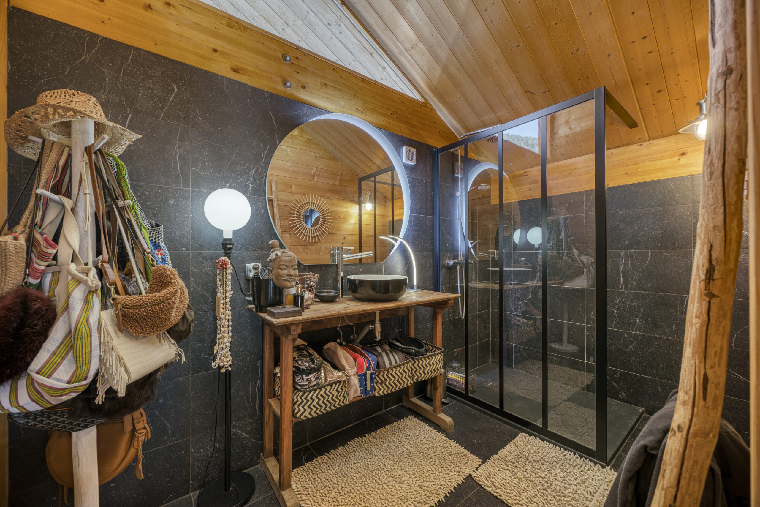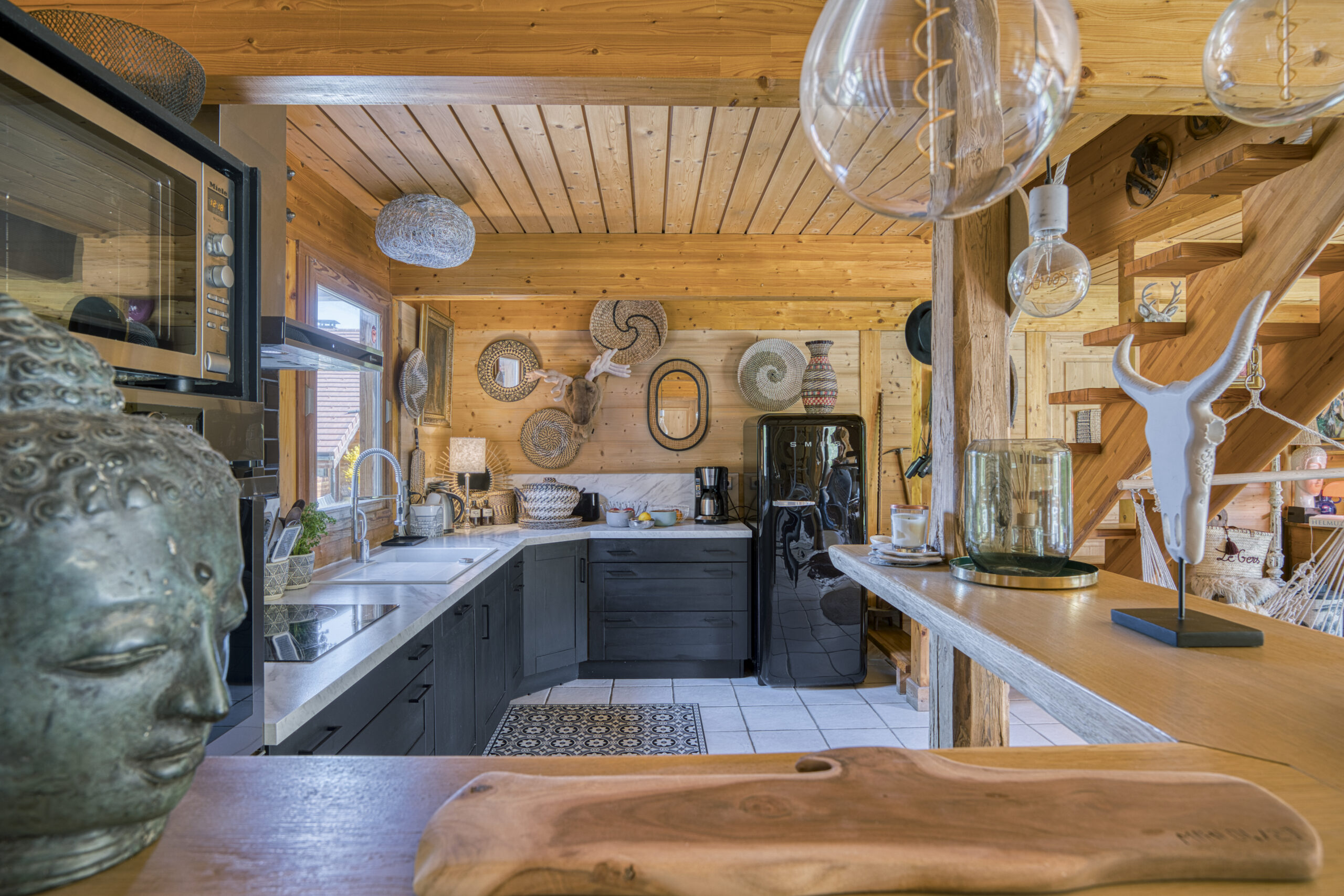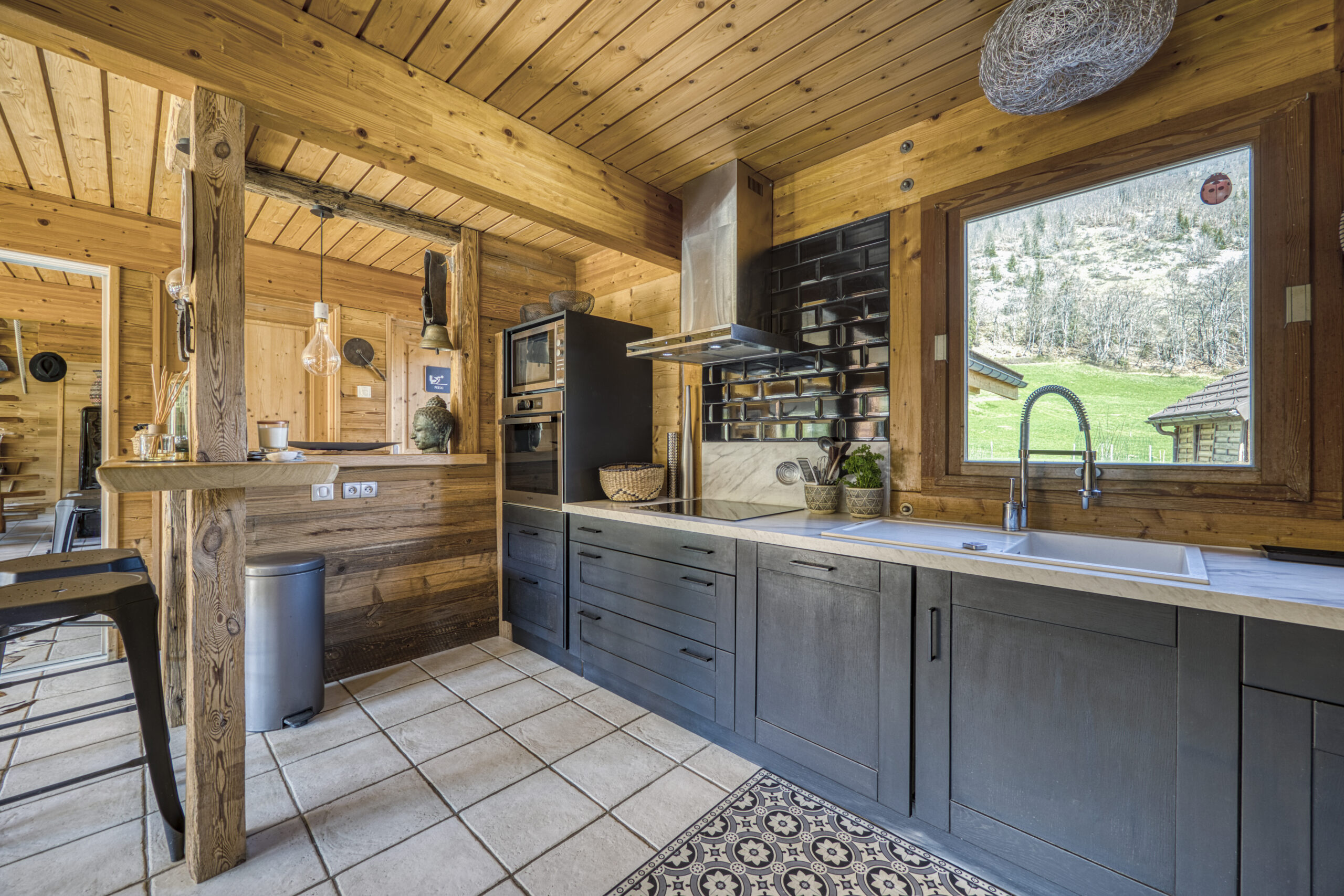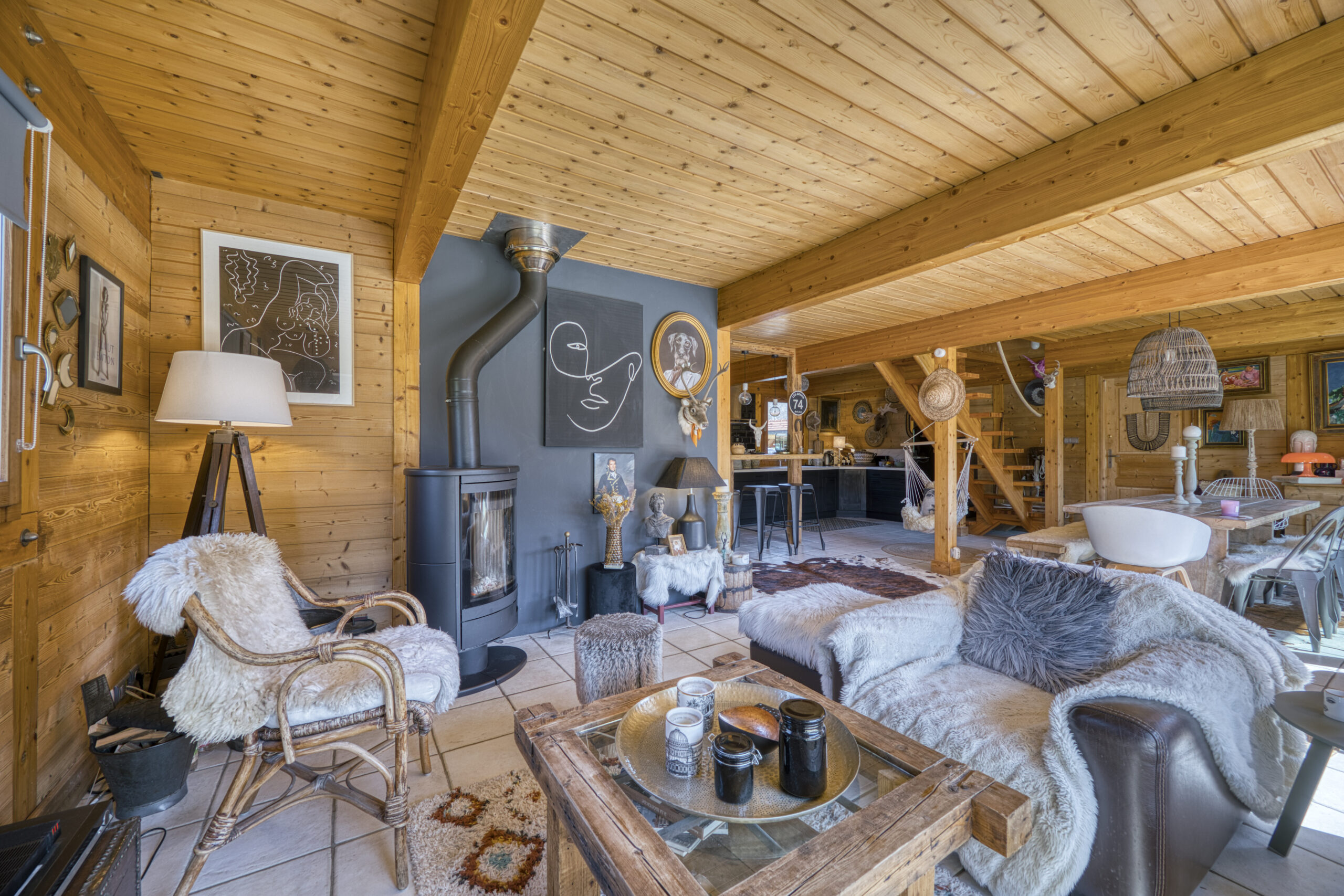 Au rez-de-chaussée, une vaste cuisine ouverte et entièrement équipée s’intègre parfaitement à l’espace salle à manger et séjour, réchauffé par un poêle à bois. Cet ensemble s’ouvre directement sur une grande terrasse exposée sud, idéale pour profiter des beaux jours.