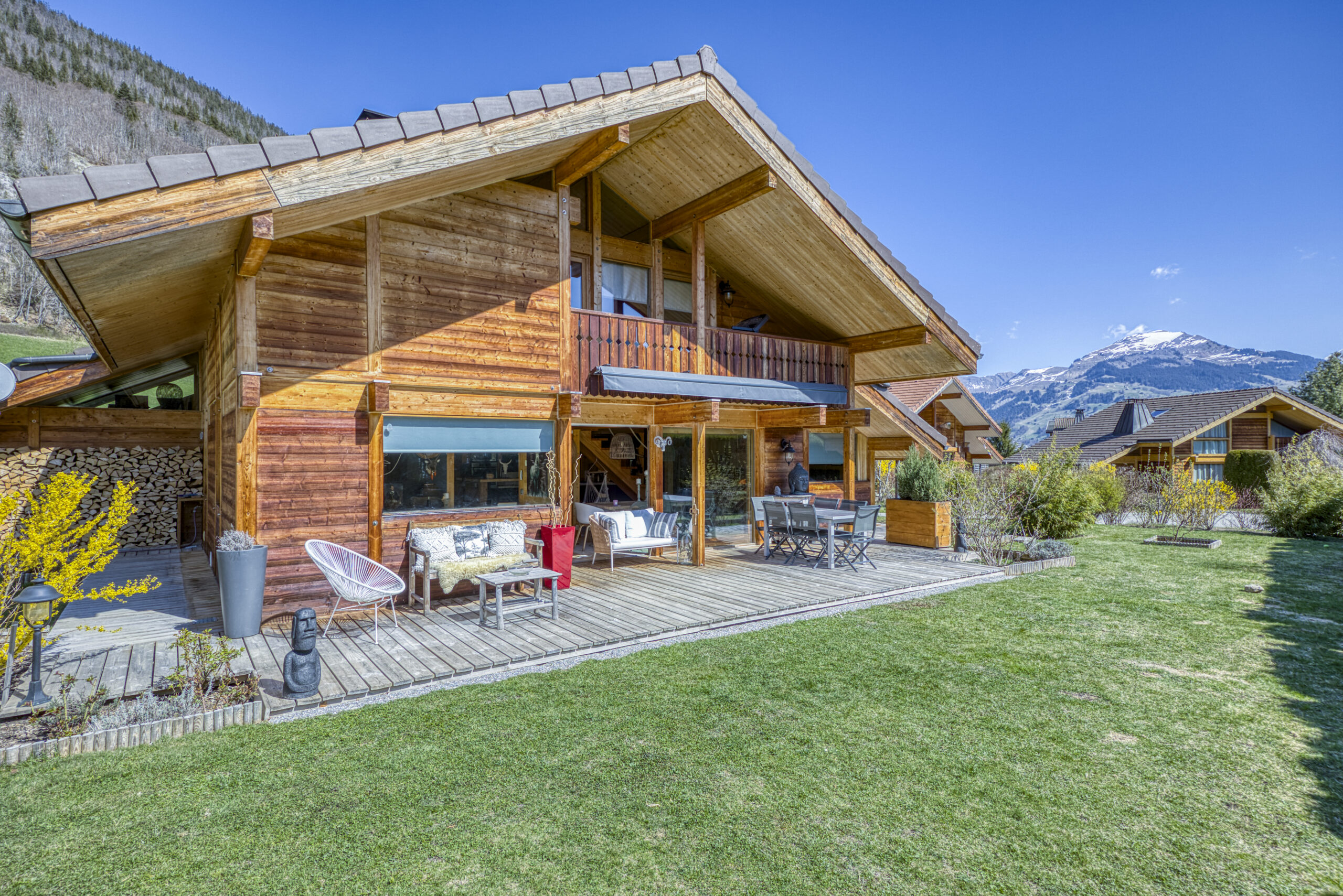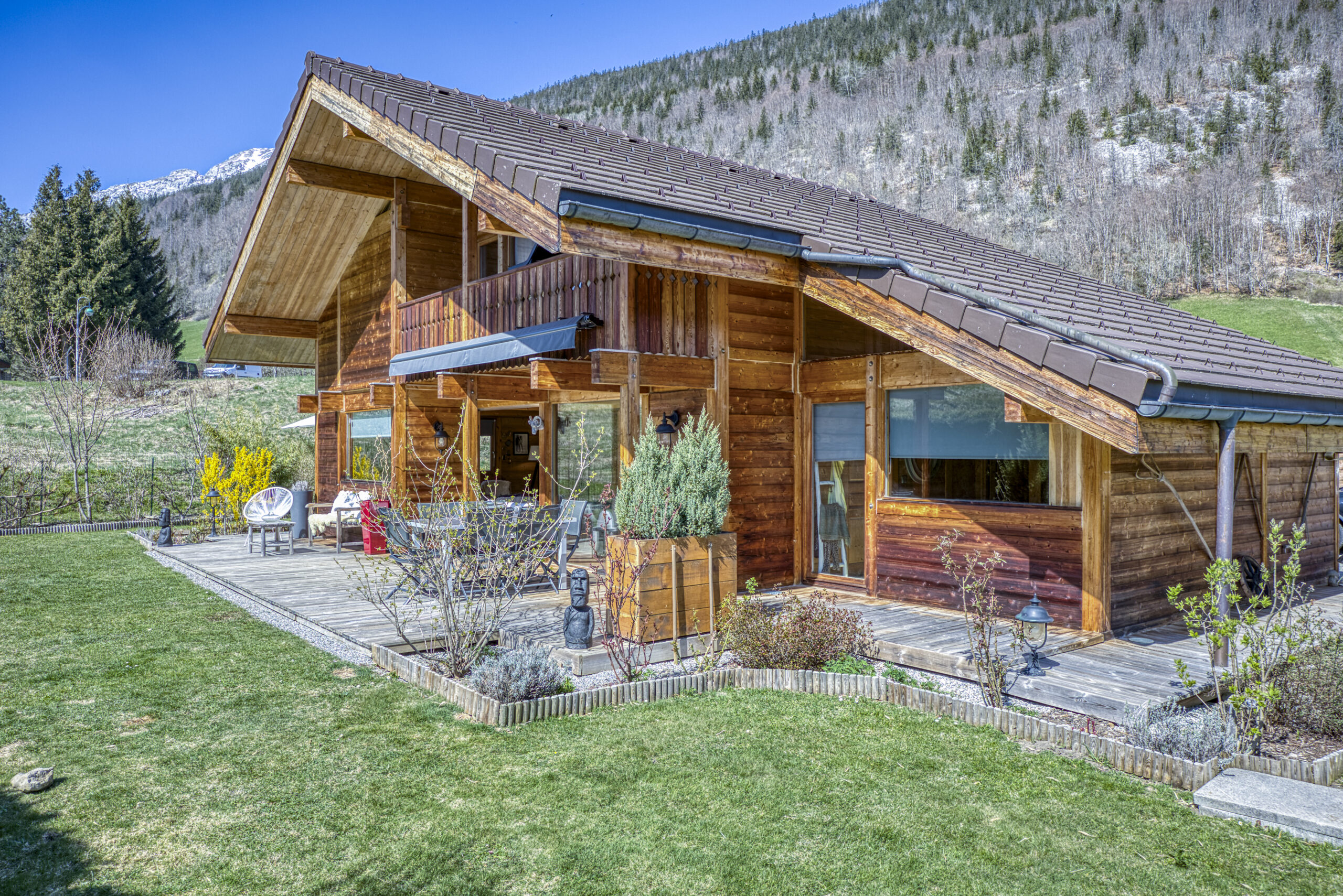 Nichée au calme au bout d’une impasse, cette belle propriété vous séduira par son environnement paisible, ensoleillé et verdoyant. Entouré de prairies et face aux montagnes, le chalet profite d’un terrain plat de 838 m², magnifiquement paysagé avec terrasses, un terrain de pétanque et un mazot faisant office d’abri de jardin.